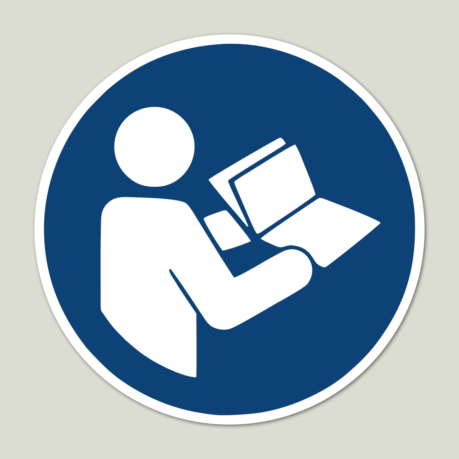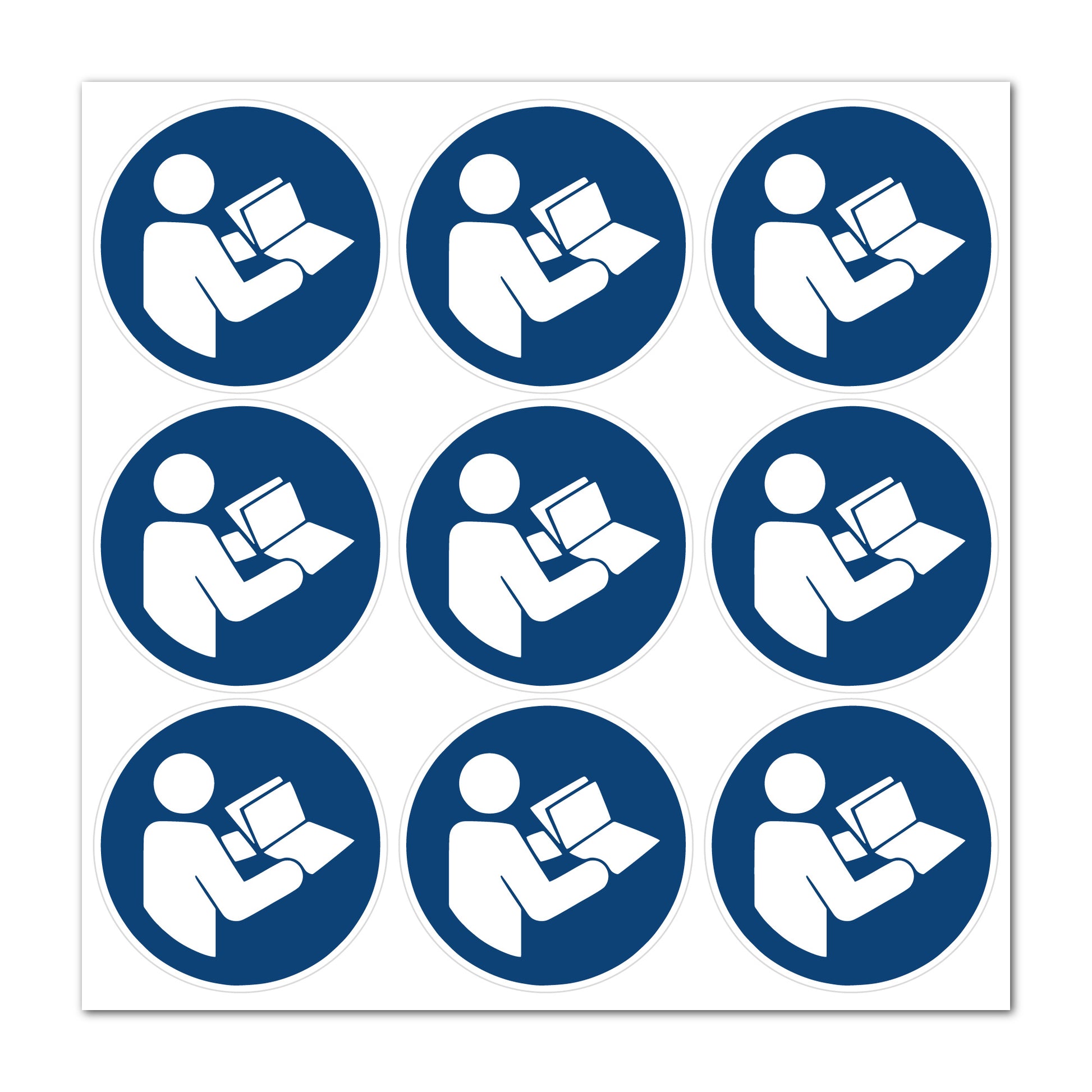 Gebotsschild Gebrauchsanweisung beachten, gemäß ASR A1.3, DIN EN ISO 7010, M002 Material: selbstklebende Folie, mit Oberflächenlaminat zum Schutz vor mechanischen und chemischen Einflüssen, Durchmesser: 50 mm 9 Stück