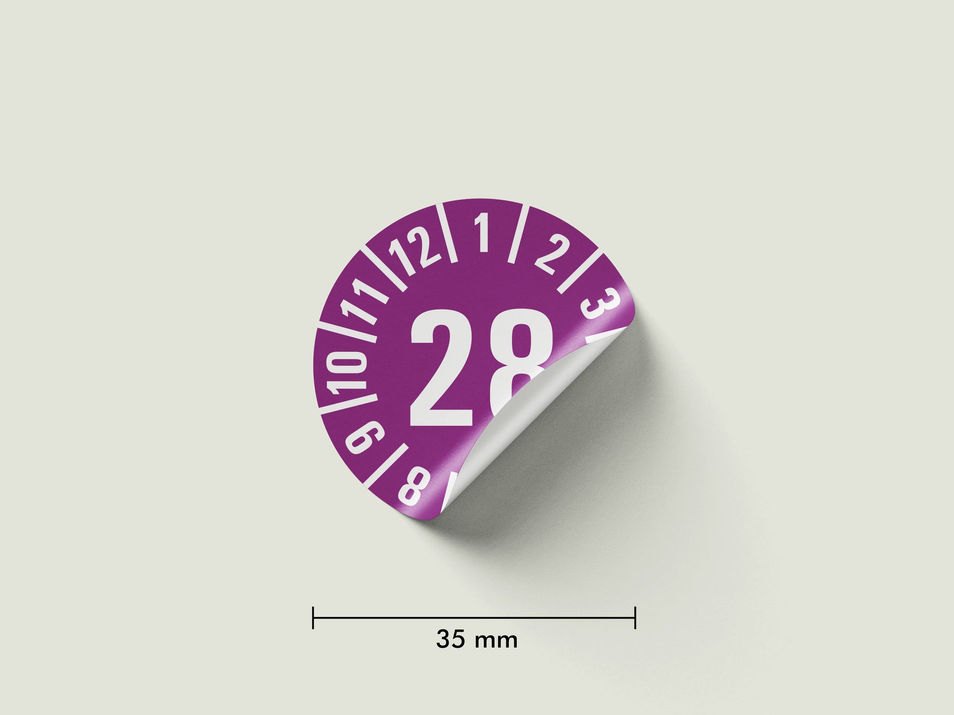 Selbstklebende Prüfplaketten 2028, Ø 35 mm. Ideal für Wartung & Sicherheit. Langlebig, fälschungssicher & einfach anzubringen. Jetzt online bestellen!