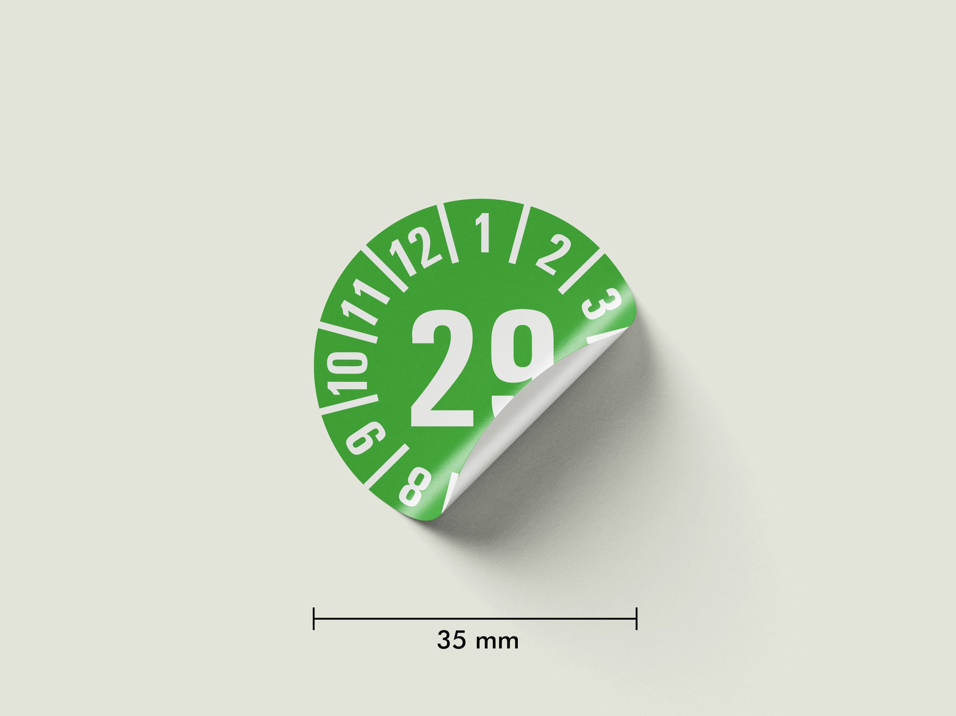 Selbstklebende Prüfplaketten 2029, Ø 35 mm. Ideal für Wartung & Sicherheit. Langlebig, fälschungssicher & einfach anzubringen. Jetzt online bestellen!